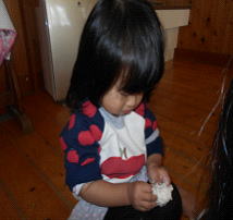 私と一緒にアイスクリームやかたつむりを作ったり、丸くこねたり、細長く伸ばしてみたりと指先を使った細かい作業が上手になってきました。