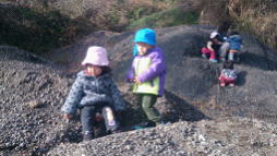 資材置き場へ到着するとさっそく砂利山へ挑戦する子ども達!大人の目線では小さな砂利山ですが、子ども達にとっては大きな山?手や足を使って踏ん張りながら登っていきますが少し登るとズルズルと滑り落ちていきます。