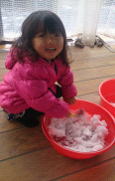 タライの中に集めた雪をスプーンで混ぜていると、ふわふわした雪はとてもおいしそうに見えたようで、♪パクッ♪と一口食べて「つめたぁ〜い」と言う子ども達の声に笑顔があふれていました。初めての冬ならではの感触を体で味わうことができました。