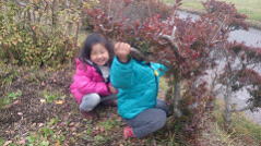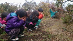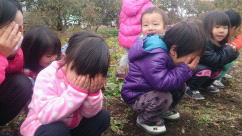 らっこ組と一緒に散歩へ出かけた時のことです。出発すると、みんなで小運動会でのマラソンを思い出し「よぉ〜いどん!」で走りだし、いつものように畑の陰にかくれて、かくれんぼが始まりました。後ろから歩いてくるお友達が来ると、「ばぁ〜!」と出て行って驚かせて楽しんでいます。