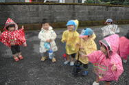 子ども達の気持ちが伝わったのか雨も小ぶりになり、ご希望の合羽を着用して♪どんぐりころころ♪と歌いながら保育園へ戻りました。