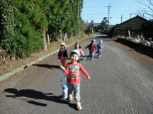 「おーい。みんな〜」と一斉に走っていく子ども達。一歳児も再会を喜び一目散に駆け寄ってきます。「ワンワンいたよ」「黒ネコがこっちにはいたんだよ」「田代先生、どこに行ったの?」「ほら、松ぼっくり。見たい」と情報交換です。保育園を出発してから段坂元地区を回り支所まで約一時間弱でしたが五名とも最後まで頑張って歩き通しました。