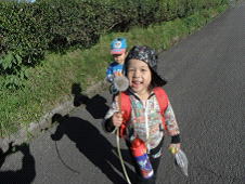 半分くらい来た場所で「先生、一歳児さんは?」「どこに一歳児は行ったの?」とゆいなちゃんがたずねてきました。「一歳児さんは支所で待ってるって」と教えるといつも一緒に生活している1歳児の姿がなくて寂しいのか「早く、行くよ」「みんな、待ってるよ」と先を急ぎ始めました。