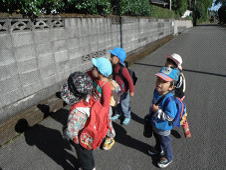 その後もカラスウリやドングリを見つけては宝物の様に袋の中にしまい大切に持ち歩く子ども達。道路の落ち葉をガサガサと音を立てて歩いてみたり、木陰の暗く冷たい道に入ると「先生、お手々」「手を繋ごう、先生」とこうすけ君とれん君が近寄ってきます。「ここ、暗いよ」「ちょっと寒いし・・」と気温の変化がわかり木陰で寒々とした雰囲気は怖いようでした。