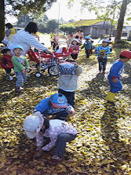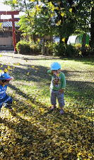 合同散歩の日、みんなで近くの神社に行きました。黄色い絨毯が気持ちいい銀杏の感触を素足で感じる子ども達。「なんか、柔らかい」「気持ちがいいね」と言葉が聞こえます。「わあ〜見て見てきれいだよ。」と風に揺られて銀杏の葉が落ちてくると子ども達は捕まえようと走り回ります。