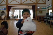 かもしか組の子ども達はすぐに外へ駆け出しますが、未満児は寒くて動きません。そこでみんなが登園して来るまでホールに雪を持ち込み遊びました。大きなボールに2つ雪を山盛りに詰めてシートの上に置くと小さく丸めてはおにぎりと勘違いして食べる子やかき氷と間違って口に運ぶ子など様々。みんな冷たさも忘れて雪にくぎつけです。