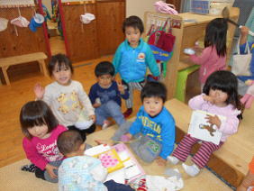 14日(水)文:ビッグ絵本 17日(土)合同散歩 15日(木)描:プチマジック 18日(月)わ:なべなべ 16日(金)手:スタンプ 19日(火)体:三輪車