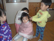 しばらくすると無事に終了したらしく、「こっちに来てください」と畳みの上に布団が敷かれ「ここに寝てください」「疲れたでしょう」と優しく寝かされました。その内にお迎えが次々にこられて子ども達の床屋さんも自然と閉店になりました。遊びを目の当たりにしながら子どもの観察力や成長に驚かされる毎日です。子ども達はあそびの主人公になれる「ごっこ遊び」が大好きです。「病院ごっこ」や「電車ごっこ」など「ごっこあそび」の中で日常の生活で体験したことや自分のイメージを言葉や動作で表現しながら楽しめるようになってきました。もうすぐこりす組での生活も終わり。泣いたり笑ったり喧嘩したり・・色々な姿が思い出されます。