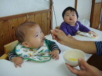 一口食べる事に素敵な表情を見せてくれます。一方りゅうのすけ君はまだスープの味に慣れず,口を開けたり,開けなかったり・・・。食べるごとににこっと喜んだり,表情を曇らせたり・・・。2人とも他の子が食べているのにも興味津々。これから月を追うことにペースト→刻み(細かい)→形のあるものへと変わっていきます。お家の方と情報交換をしながら進めて行けたらと思います。