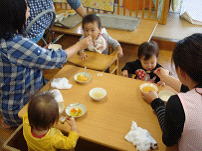 最初は2人とも表情を曇らせ,また眉間にしわを寄せながら食べていましたが,少しずつ回数を重ねることで笑顔が見られるようになりました。ぱくっと一口食べるごとにもぐもぐとよーく噛むまゆちゃん。えいたくんは,私たちのあげるタイミングが遅いと芋の中に手を入れ食べようとします。まだまだ口に持っていくということはできませんが,食べたい!という気持ちはとても伝わってきます。また「おいしいね」と声を掛けると,タイミングがよかったのか2人で顔を見合わせ,笑っていました(たまたまでしょうか?)2人とも食欲は十分です。「おいしいね」などと声を掛け,楽しみながら進めていきたいと思います。