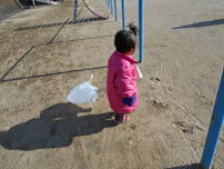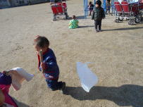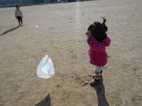 当日は残念な事に雨の為外でたこをあげることは出来ませんでしたが、大隅町の体育館を借りていた為、そこまで移動をし、室内であげました。凧をもち♪たこ〜たこ〜あがれ♪と歌を歌いながら走るとそれを真似しななみちゃん、ゆうせいくん、なつきくんも嬉しそうに走ります。凧があがるというよりは引きずる・・・でしたが、子どもたちの楽しそうな表情に私も童心にかえり一緒に遊ぶことでした。その日は1時間ほど体育館でたくさん遊び園に帰りました。