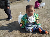 また土曜日は晴天にも恵まれ、0歳児〜5歳児みんなで小学校に散歩に行き、外で凧上げ大会をしました。以上児さんが凧を揚げるを見ていたしゅんたろうくん、ななみちゃん、せいやくん。手渡すと糸部分をもちあげようとしていました。再び私も童心にかえり凧を上げますと、その凧を目で必死に追うももはちゃん。ハイハイで近づき凧の様子をじっと見つめていました。だいやくんやりゅうのすけくん、まゆちゃん、えいたくんも座ったままでしたが凧をもったり、ビニールで遊んだりとしていました。
